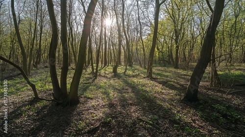 Naklejka premium Silent forest in spring with bright sun rays peeking through the trees