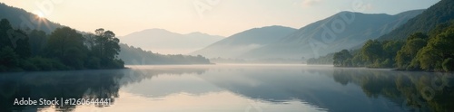 © Sathaporn Buarabut, Fototapeta premium Silent morning by riverbank with Scottish hills in the background, Misty, Landscape