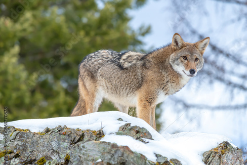 Obraz premium Silent Tracker: Coyote on the Hunt in Montana’s Winter Mountains