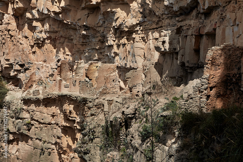 Fototapeta premium Silent witnesses carved into the cliffs of Chachapoyas, La Ciudad de los Muertos emerges from the rock as a timeless necropolis. These ancient funerary niches, perched high above the valley.