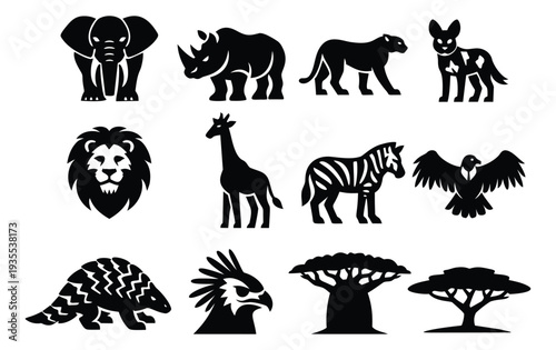 Fototapeta premium Silhouette African wildlife set featuring elephants, lions, zebras, and baobab trees for nature-themed projects