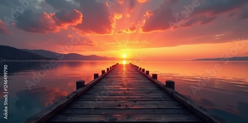 Obraz premium Silhouette at the end of rustic pier, facing sunset over still water ,...