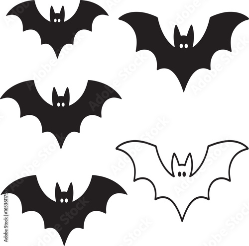© MD HASANUZZAMAN, Naklejka premium Silhouette Bats Vector Graphic, Halloween Decorations or Spooky Cartoon Elements, Four Black Bats and One Outline Version on White
