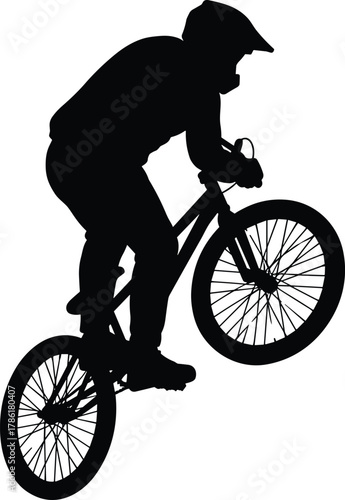 © Aiub, Fototapeta premium Silhouette, BMX, stunt, cyclist, airborne, jump, extreme, sport, helmet, action, bike, trick, motion, outdoor, adventure, rider, wheels, mid-air, performance, freestyle
