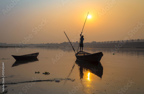 © Roop Dey, Fototapeta premium Silhouette boat with oarsman at sunset on river Damodar, Durgapur Barrage, West Bengal, India.