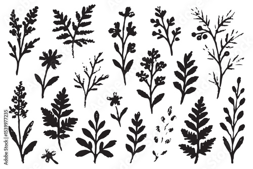 Naklejka premium silhouette botanical illustration with various detailed plant shapes, flowers, and leaves, ideal for nature themed designs