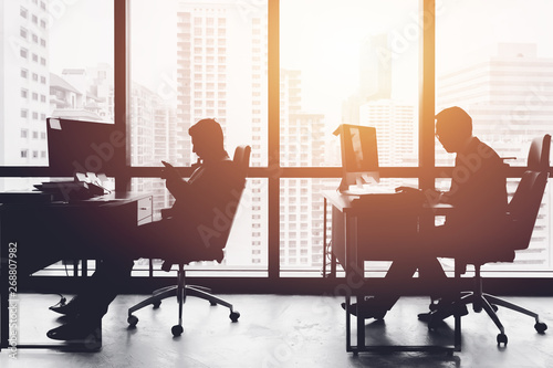 Fototapeta premium silhouette business man in office working at desk windows side with urban city view