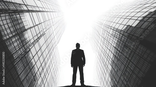 © Almahyra, Obraz premium Silhouette Businessman Facing Skyscrapers. Urban Perspective. Possible Use Stock photo for business, leadership, ambition, or modern cityscape themes