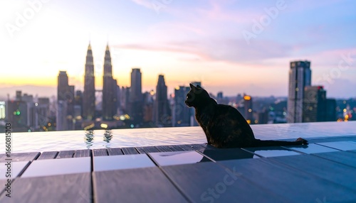 Obraz premium Silhouette cat on rooftop pool overlooking city skyline at sunrise
