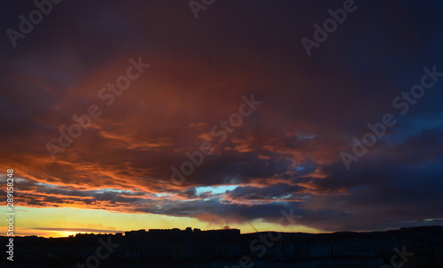 Fototapeta premium Silhouette City Sunset with clouds in Murmansk Russia with dramatic red, blue...