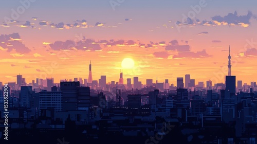 © Dhoku Studio, Fototapeta premium Silhouette cityscape at sunrise, vivid colors, artistic depiction.