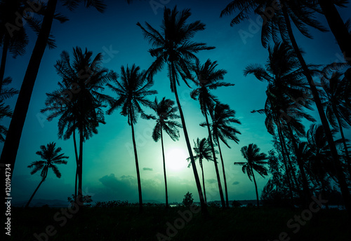 © nuttawutnuy, Naklejka premium Silhouette coconut palm trees on beach at sunset. Vintage tone.