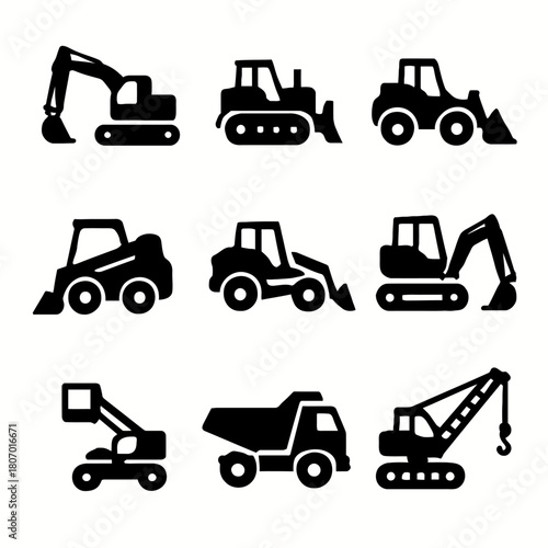 Fototapeta premium Silhouette collection of construction vehicles: excavators, bulldozers, and dump trucks