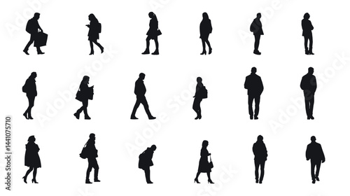 © umut hasanoglu, Fototapeta premium Silhouette Collection of People Walking Carrying Bags on White Background