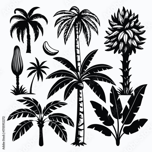Obraz premium Silhouette Collection of Tropical Palm Trees and Plants for Summer Decoration, Exotic Landscape and Botanical Designs