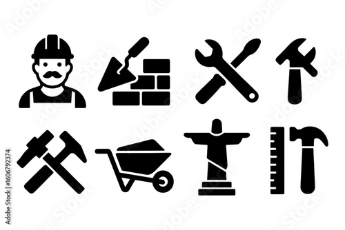 © LOBSTER LARRY, Obraz premium Silhouette construction tools and worker icon set for professional projects