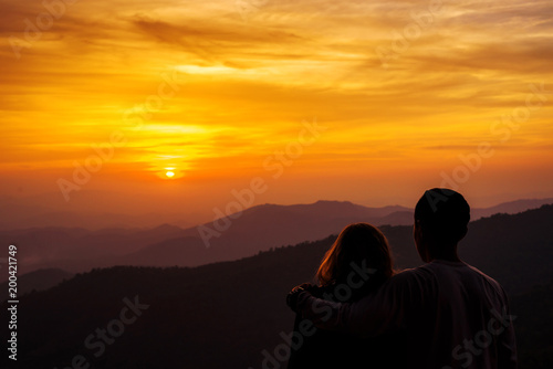 © jaboo_foto, Obraz premium silhouette Couple lover with mountains landscape in beautiful sunset sky
