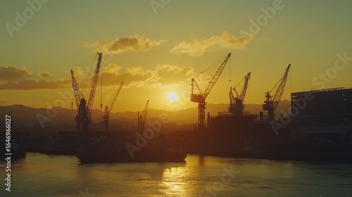 Obraz premium Silhouette Cranes Sunset Harbor