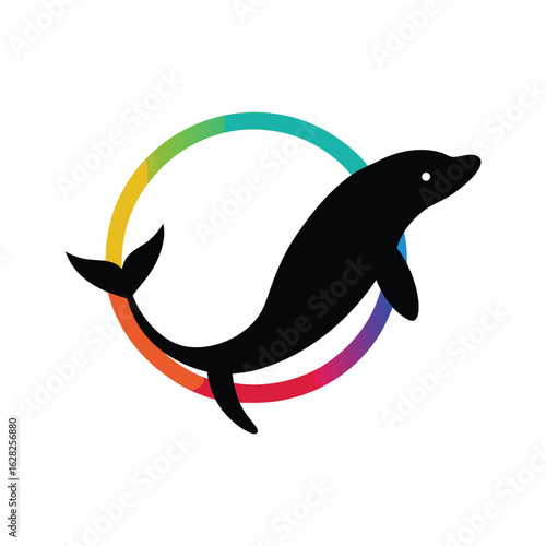 Fototapeta premium Silhouette Dolphin Jumping Through Rainbow Circle Logo animal ocean