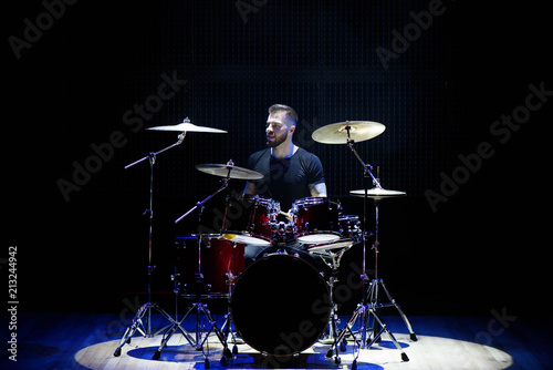 Fototapeta premium Silhouette drummer on stage. Dark background, smoke spotlights