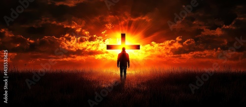 © adiba, Fototapeta premium Silhouette figure at sunset with cross