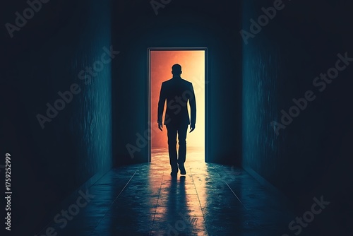 Obraz premium Silhouette figure entering mysterious light filled room picture