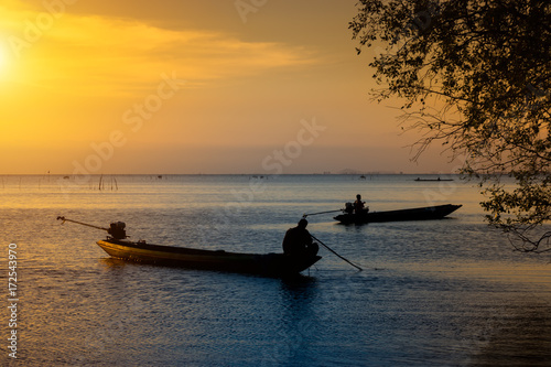 © noppharat, Naklejka premium Silhouette fisherman and Sunset sky on the lake.