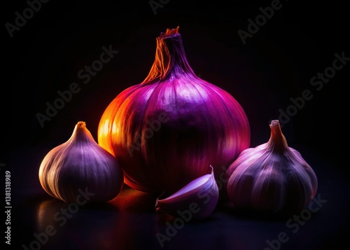 Obraz premium Silhouette Garlic Cloves, Black Background, Isolated Food Photography, Dark Gourmet Image, Single Garlic Bulb Silhouette