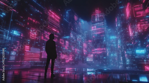 © setiawan, Fototapeta premium Silhouette Gazing at a Cyberpunk Metropolis Bathed in Neon Lights and Reflections