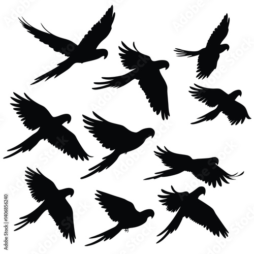 © Opaq1, Fototapeta premium Silhouette Grouping of Macaw Birds in Flight on a Transparent Background