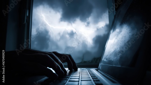© husyaima, Obraz premium Silhouette Hands Typing On Laptop During Stormy Night