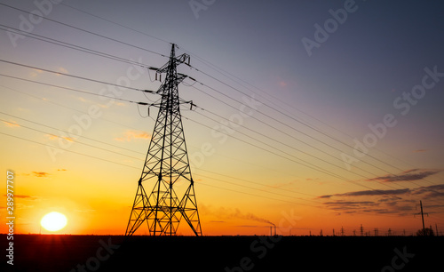 © es0lex, Fototapeta premium Silhouette High voltage electric towers at sunset time. High-voltage power lines. Electricity distribution station