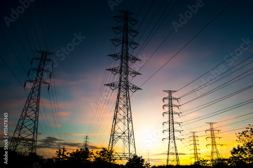 © yongyutp, Fototapeta premium Silhouette High voltage post. High-voltage tower on sunrise background