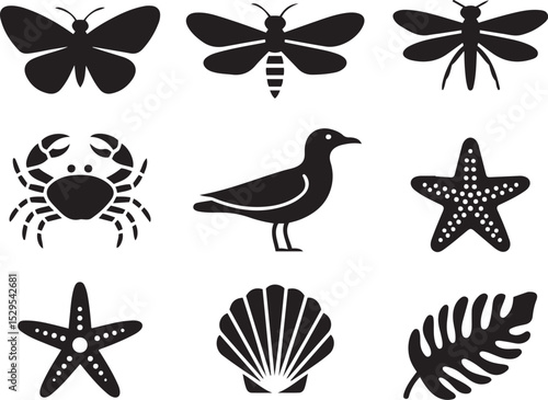 © Pritam, Naklejka premium Silhouette icon set of summer wildlife and nature elements including butterfly, bee, dragonfly, seagull, crab, starfish, seashell, and tropical leaf