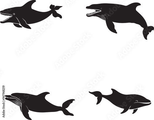 © AP vector & Png, Fototapeta premium Silhouette icon whales open mouth chasing small