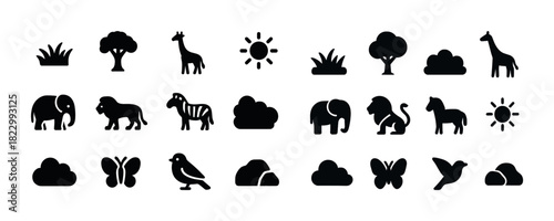 © Влада Яковенко, Fototapeta premium Silhouette icons of african animals, nature, clouds, and sun