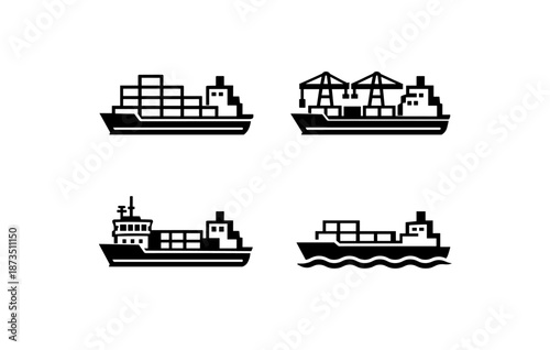 Obraz premium Silhouette icons of cargo ships with containers and cranes