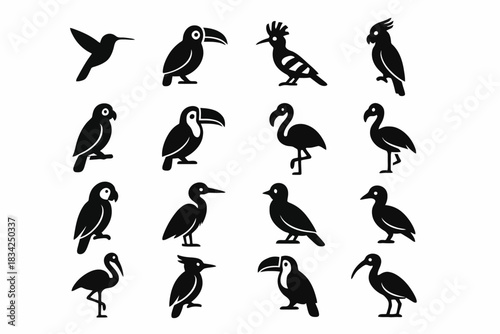 Fototapeta premium Silhouette icons of diverse bird species with unique features and postures