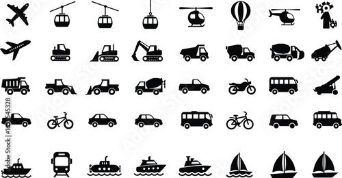 © MDALRAFIN, Fototapeta premium Silhouette Icons of Transportation Vehicles, Cars, Buses, Trucks, Trains, Boats, Aircraft, Construction Machines, Bikes, Helicopters, Travel and Transport