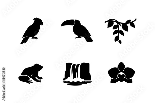 Fototapeta premium Silhouette icons of tropical wildlife and nature elements