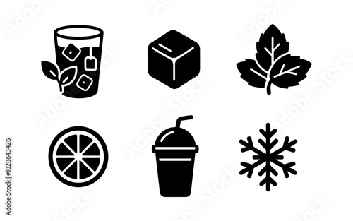 Obraz premium Silhouette icons: refreshing iced tea, leaf, ice cube, citrus, snowflake, beverage