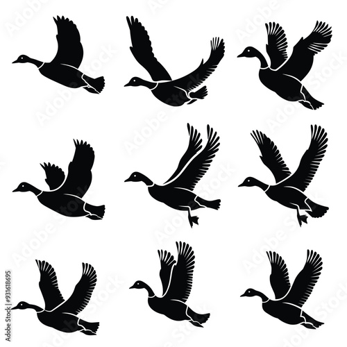 © umut hasanoglu, Obraz premium Silhouette illustrations of nine ducks in various flying poses on a white background.