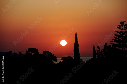 © Wioletta, Obraz premium Silhouette landscape with sunrise over trees and sea