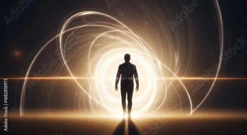 Fototapeta premium Silhouette Man Walking Towards Light Portal with Luminous Energy Swirls