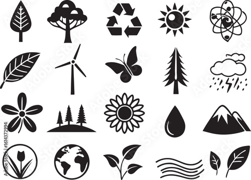 © Uhartist35, Fototapeta premium Silhouette Nature & Environment Icons Set on White Background Eco, Green, Recycle, Minimal Design Vector Pack