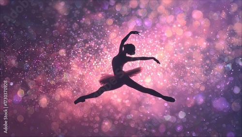 © irul, Naklejka premium Silhouette of a ballerina leaping against a vibrant cosmic backdrop
