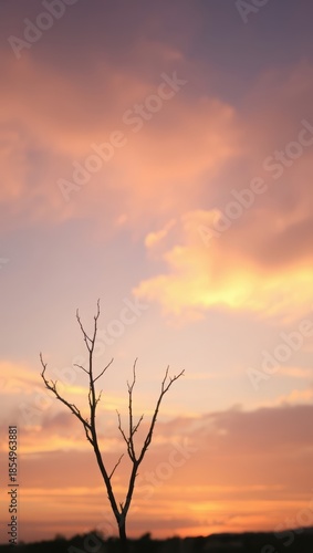 © Leo_Arts, Obraz premium Silhouette of a bare tree against a vibrant sunset with colorful clouds above it