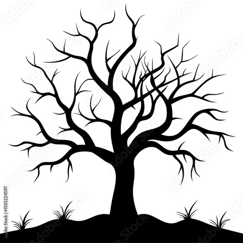 © QuickDesign24, Obraz premium Silhouette of a bare tree with branches and roots on a small hill with grass against white background
