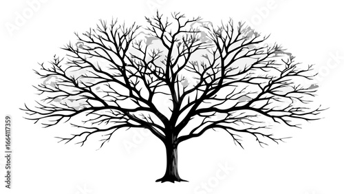Obraz premium Silhouette of a bare tree with intricate branches against a white background in grayscale illustration