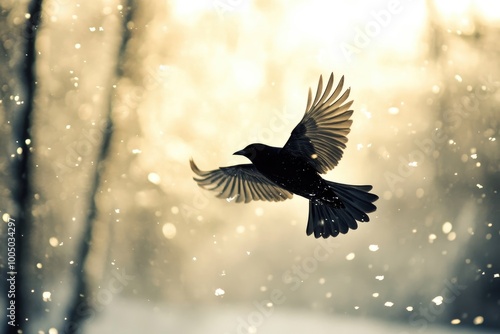 © MrHamster, Obraz premium Silhouette of a Bird Flying Through Snowfall